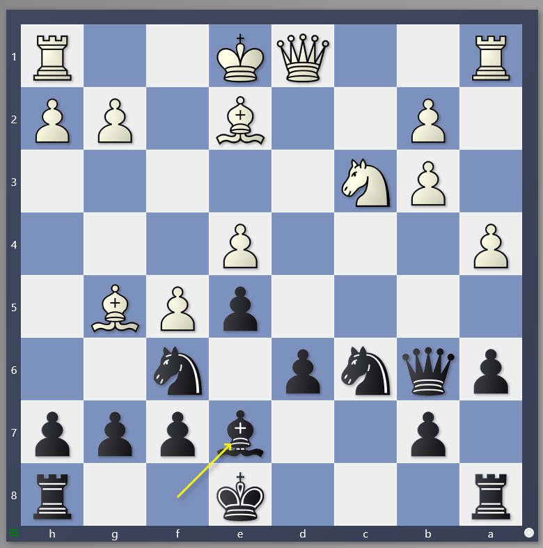Ensuite après une série de coups forcés, on arrive à la position suivante où l'on peut comprendre l'idée du sacrifice les noirs. Ils vont bloquer sur les cases noires la majorité de pions des blancs et par contre leur majorité sur l'aile roi est mobile et va aider à une attaque sur l'aile roi.