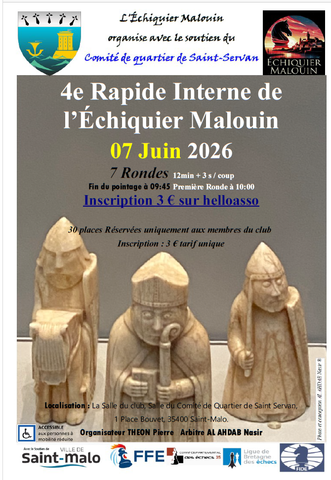 L'Échiquier Malouin organise son 4e Tournoi Interne de Parties Rapides le dimanche 07/06/2026. Ce tournoi en cadence rapide (12 min + 3 s / coup) en 7 rondes, est homologué FFE et FIDE. une Licence A ou B est requise. (30 places). L'inscription est de 3 € (tarif unique) par helloasso. ATTENTION : Tournoi réservé aux membres de l''Échiquier Malouin. Aucun remboursement ne sera effectué. Vous n'avez pas d'obligation de faire un don à helloasso.