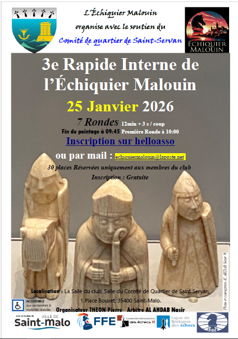 L'Échiquier Malouin organise son troisième tournoi interne de parties rapides le dimanche 25/01/2026.
