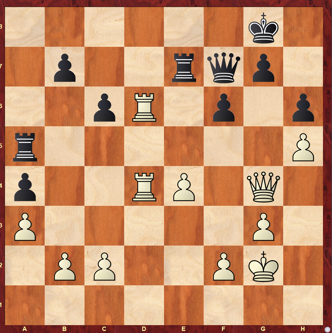 Samedi 21, nous avons analysé quelques finales pratiques, en insistant sur l'importance des pions passés, de l'activité du roi et de la bonne connaissance des finales théoriques (Philidor, Lucena ...). La position ci-dessous (cliquer sur le titre), tirée d'une partie Svane-Sargsyan 2025 illustre le thème des pions passés. Les B ont gagné après 1 Dg6! Dxg6 2 hxg6 Rf8 3 Td8+ Te8 4 T4d7! Txd8+ 5 Txd8 Re7 6 Tg8! Tb5 7 Txg7+ Rf8 8 Tf7+ Rg8 9 Txf6 Rg7 10 Td6 Txb2 11 f4! Txc2+ 12 Rh3 Te2 13 e5 h5 14 g4! (14 f5 était plus simple) Te4 15 Rg3 h4+ 16 Rxh4 Txf4 17 Rg5 Tf3 18 Td7+ Rg8 19 e6 Te3 20 e7 1-0
